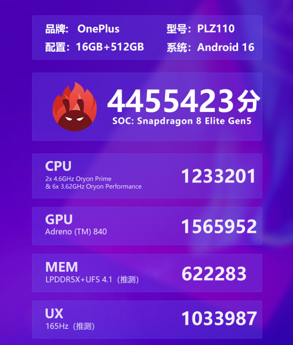 【CNMO科技消息】3月3日,安兔兔官方宣布,后台发现了型号为PLZ110的一加新机,很有可能是即将发布的一加15T。该机安兔兔V11总分达到了4455423,其中CPU成绩1233201、GPU成绩1565952、MEM成绩622283、UX成绩则是1033987。