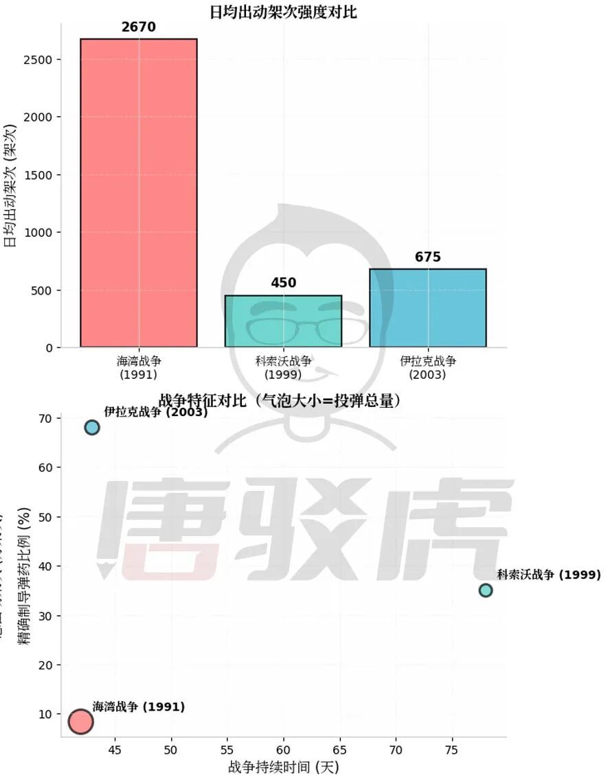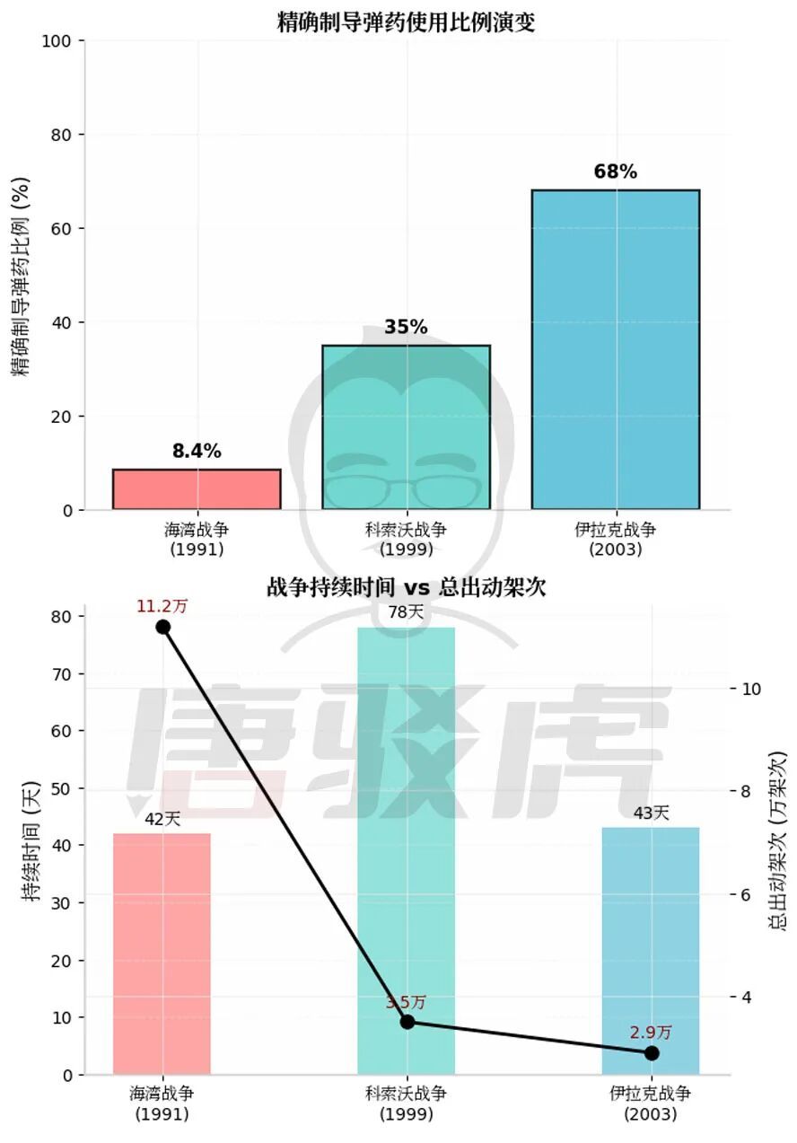 这时必须引入前三次大型空中战役的数据进行标尺化对比,特别是1999年科索沃战争——那是人类历史上首次主要依靠精确制导武器迫使一个中等国家屈服的战例。