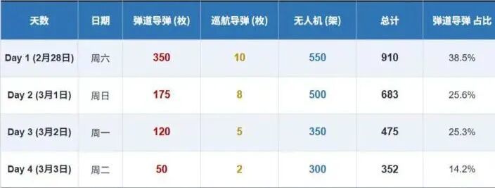 2. 据统计,伊朗4天内累计发射约700枚弹道导弹、1850架无人机,发射平台损失过半,其导弹部队已被迫转入艰难的游击战,反击的战术意义逐渐归零。综合兵力数量、发射条件及美以摧毁效率,笔者估算,伊朗的反击能力可能在一周内(导弹)至10-20天内(无人机)基本衰竭,能零星发射,但已无战术意义。