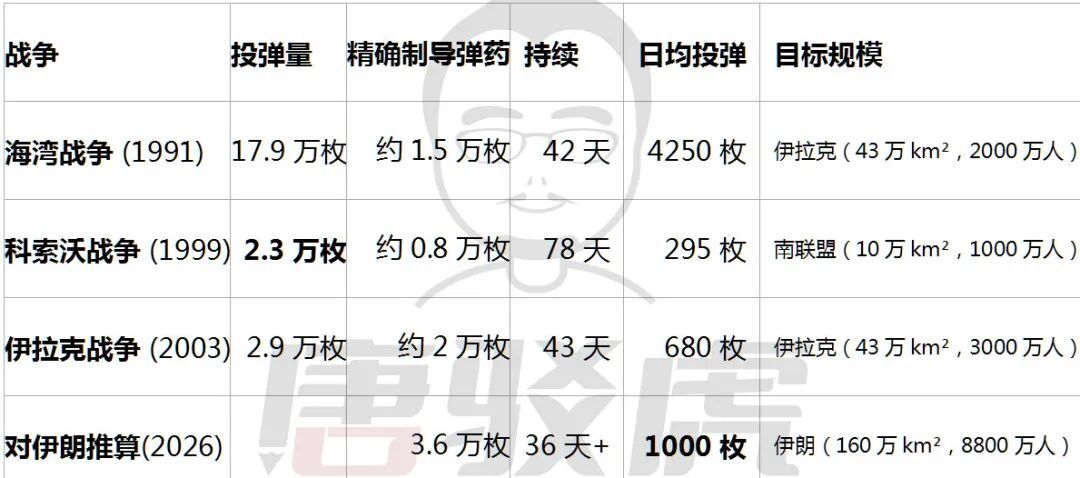 若按科索沃战争“每万名军人投弹2300枚”的同等军事密度计算,对伊朗45万军队需要 10.4万枚弹药(相当于4.5次科索沃战争)。