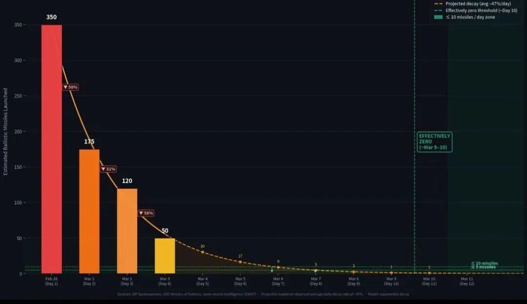 综合弹道导弹与无人机的数量、发射条件及美以摧毁效率,一个清晰的结论浮现:伊朗的反击能力将在一周内(导弹)至10-20天(无人机)内基本衰竭,能零星发射但已无战术意义。