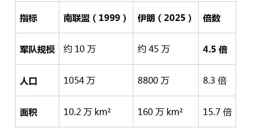2026年的伊朗:国土面积160万平方公里(南联盟的15.7倍),人口8800万(8.3倍),军队约45万人(4.5倍)。