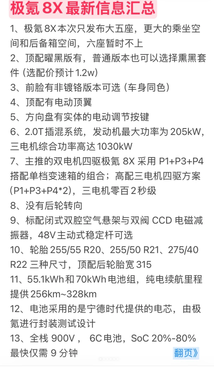 极氪全新大五座 SUV 车型 8X 核心配置与上市信息正式汇总曝光,新车锁定 35-48 万中高端市场,此次仅推出大五座版本并打造超大驾乘与储物空间线上配资之家,在动力、补能、智驾、舒适配置上全面拉满,搭载 2.0T 插混系统,三电机版本综合功率破千匹,零百加速迈入 2 秒级,同时标配 900V 架构、闭式双腔空悬,智驾与豪华舒适配置也做到同级标杆水准,3 月 16 日将开启小订并推出多重福利,成为中大型五座 SUV 市场的重磅竞争者。
