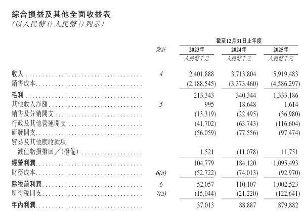 招股书显示,在过去的2023年、2024年和2025年,晶存科技的营业收入分别为人民币24.02亿、37.14亿和59.19亿元,相应的净利润分别为人民币0.37亿、0.89亿和8.80亿元。