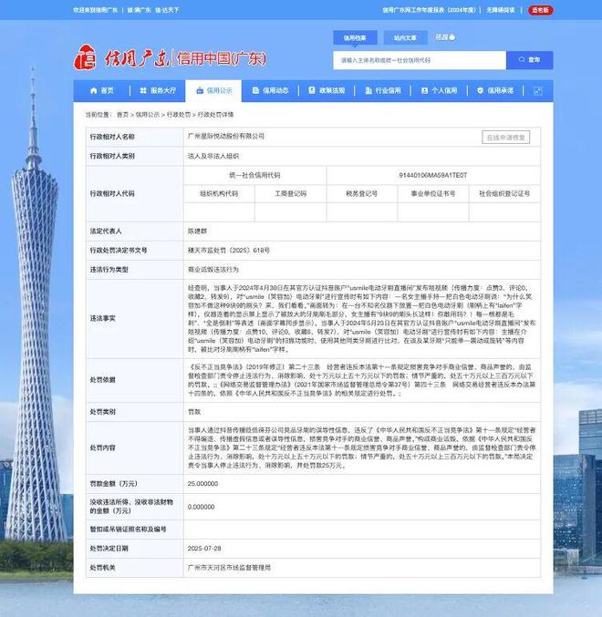 根据信用中国(广东)的信用公示,2025年7月28日,广州星际悦动股份有限公司遭到行政处罚,违法行为类型明确为商业诋毁。