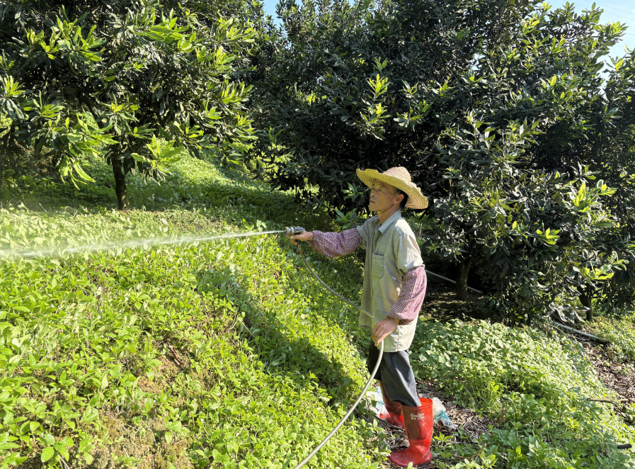 此外,山坡另一边的工人梁伯正拿着水枪喷草,为后期的夏威夷果采摘做足准备。他说,自己在农场工作已经6年了,平时主要负责施肥和除草。