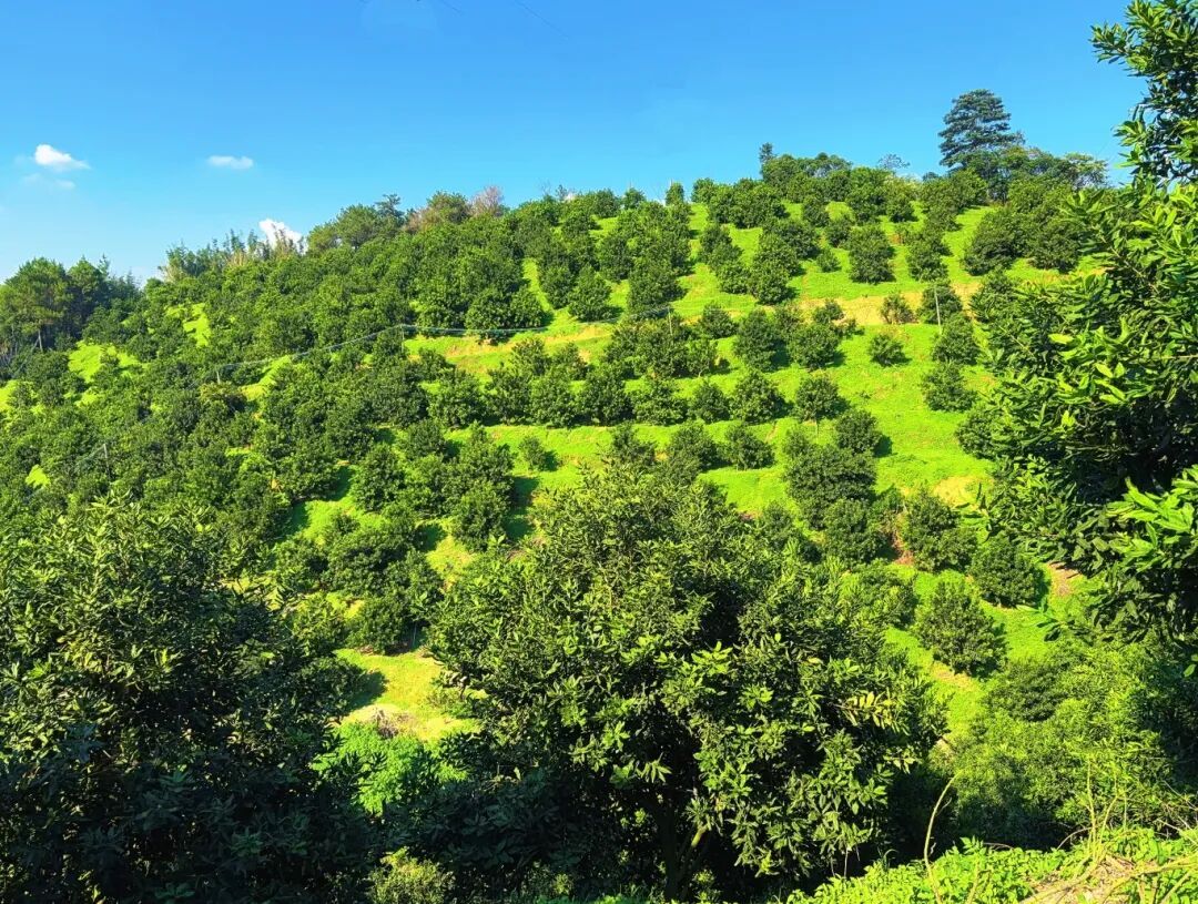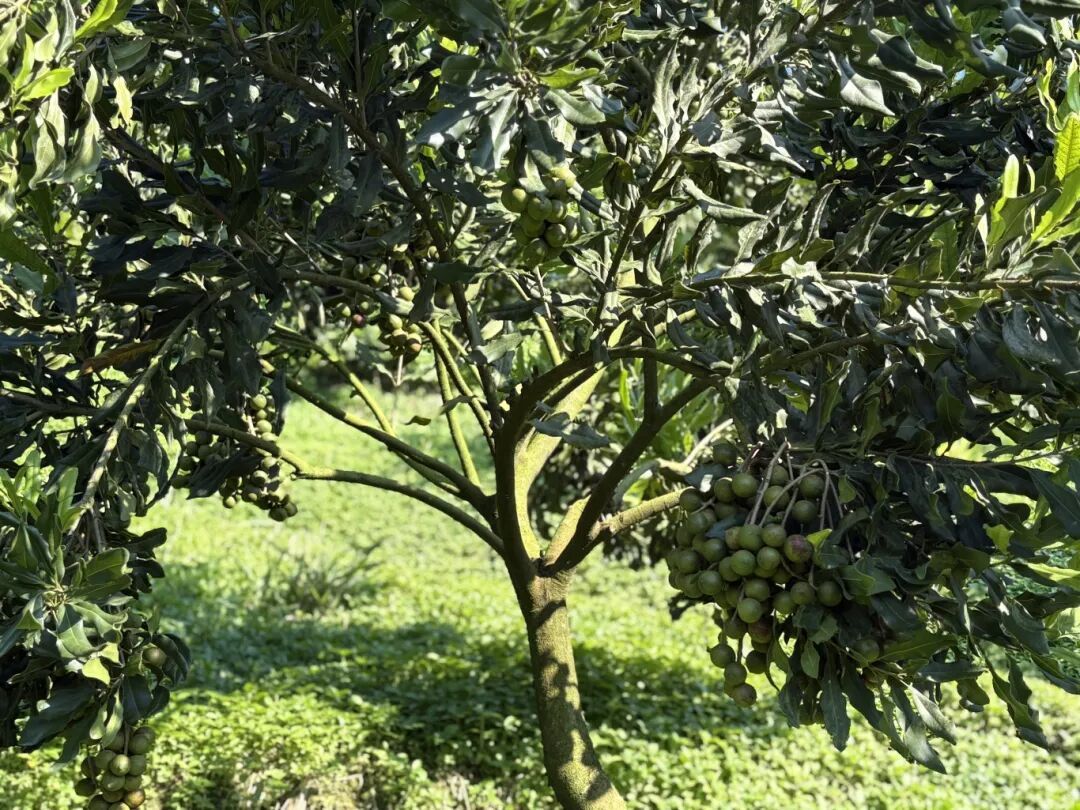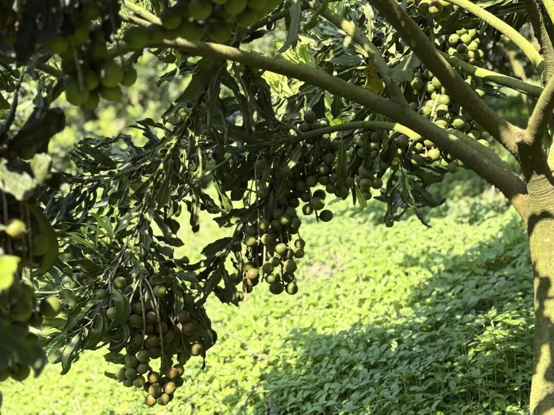 秋日丰收季,坚果压山脊。位于江屯镇坑口村委会的江伟生态农场山坡上,漫山遍野的夏威夷果树挺拔而立、枝繁叶茂,一串串硕大浑圆的“绿宝石”沉甸甸地垂挂,压弯了枝头。微风拂过,空气中弥漫着淡淡的坚果清香。