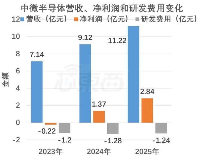 2023年、2024年和2025年,中微半导体的营收分别约为7.14亿元、9.12亿元和11.22亿元,三年增长约57.14%。净利润分别约为-0.22亿元、1.37亿元和2.84亿元。研发费用分别约为1.2亿元、1.28亿元和1.24亿元。