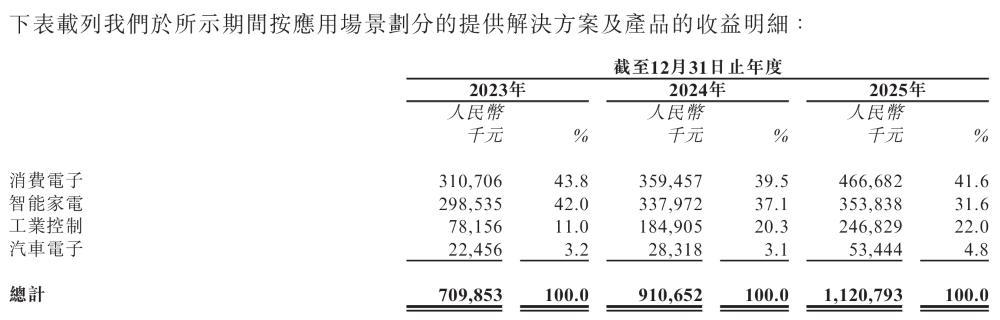按应用场景划分,中微半导体的消费电子及智能家电对营收的贡献占比最多,三年间累计贡献了85.8%,76.6%和73.2%的营收。不同应用领域的收益分布整体上保持相对稳定。