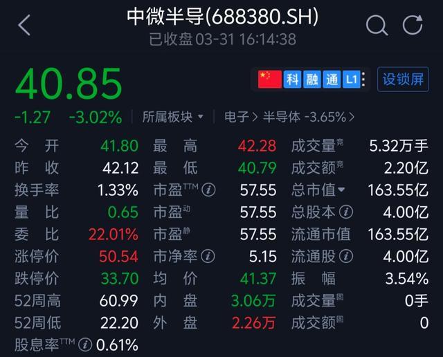 2022年,中微半导体于上海证券交易所科创板上市,募资19.44亿,截至3月31日收盘A股市值为163.55亿元。