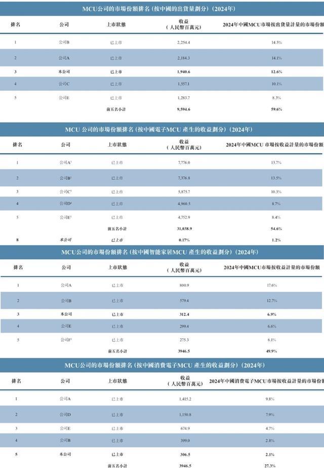 弗若斯特沙利文的研究资料显示,中微半导体是国内最早自主研发设计MCU的企业之一。按2024年出货量计算,中微半导体为中国排名第一的MCU企业,市场占有率为12.6%,而以收益计则排名第三。按同年收益计算,中微半导体在中国智能家电领域的MCU芯片市场排名第一,在消费电子领域MCU芯片市场排名第二。