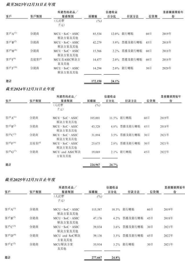 2023年、2024年及2025年期间,中微半导体的五大客户贡献的收益分别约为1.72亿元、2.25亿元以及2.78亿元,分别占同年度总收益的24.1%、24.7%及24.8%。其中,最大客户贡献的收益分别约为0.85亿元、1.05亿元以及1.16亿元,分别占同年度总收益的12%、11.5%及10.3%。