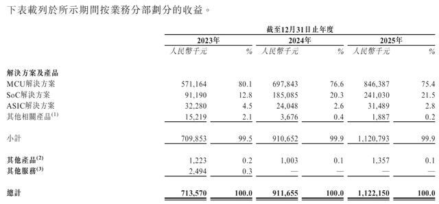 按业务线划分,中微半导体2023年到2025年收益整体增长。其中,MCU解决方案对营收的贡献在三年间占比最高,分别贡献了约5.71亿元、6.98亿元和8.46亿元,占总营收的比重分别为80.1%、76.6%和75.4%。